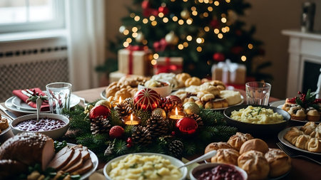 A Christmas dinner table filled with a variety of festive dishes, including roasted meats, fruits, and sweets, surrounded by holiday decorations and greenery.