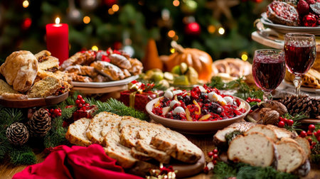 A bountiful holiday spread featuring an assortment of breads, salads, and glasses of red wine, surrounded by festive Christmas decorations, perfect for holiday gatherings and feasts.