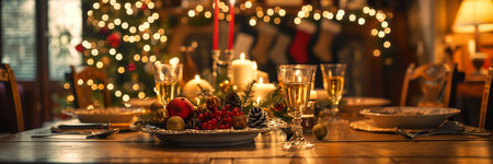 Elegant Christmas dinner table setting with crystal glasses, pine garland, golden candles and ornaments. Softly lit tree creates magical bokeh background in sophisticated dining room.
