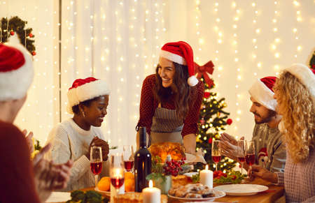 Happy multiracial friends sit at table eating delicious food celebrate Christmas eve. Smiling diverse international people dinning together on New Year winter holidays at home. Celebration concept.