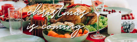 table served with delicious pie, roasted turkey and vegetables near christmas is coming lettering near candles, banner