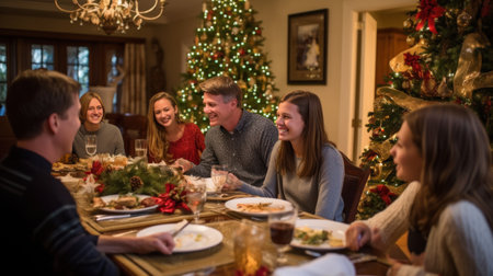 Merry Christmas and Happy Holidays! Cheerful family having dinner together at home.