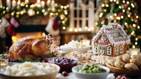 Traditional Christmas Holiday Feast Dinner Table: Roasted Turkey, Cranberry Sauce, and Gingerbread House Against a Sparkling Background of Cozy, Lit Decorations and Fireplace.