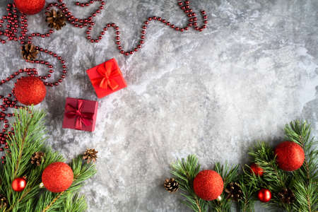 Christmas background with fir branches, gift boxes, red balls and cones. Top view with copy space