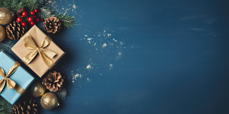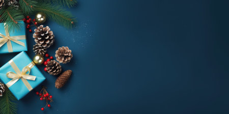 A Christmas-themed background featuring blue-wrapped gifts, pine branches, ornaments, and festive decorations on a blue surface. The image captures the holiday spirit and winter celebrations.