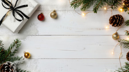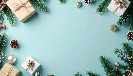 A top-down shot of a Christmas flat lay featuring gift boxes, fir branches, and shiny balls, with plenty of room for your own holiday message.
