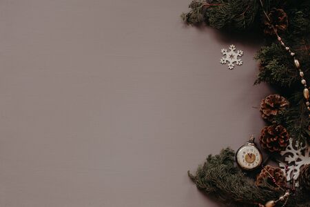 Christmas background with fir branches and Christmas decor. Top view, copy space for text.