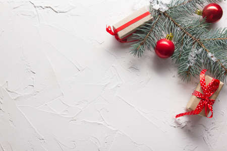 Christmas or New Year background with fir tree branches, red balls, gift boxes and decorations. Top view with copy space