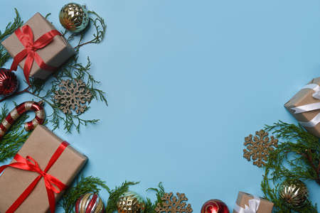 Christmas frame background. Composition with Christmas gift boxes, fir tree branches and decorations on blue background. Top view with copy space.