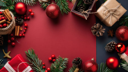 A captivating composition featuring an array of Christmas decorations, gift boxes, and winter elements on a vibrant red background, perfect for holiday themes.