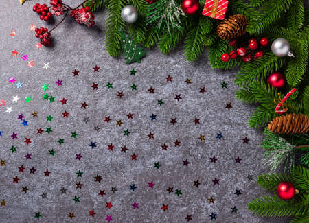 New Year template with Christmas decoration holidays. Top view flat lay of border green fir tree branches with Xmas ornaments and the star on concrete table background with copy space for text