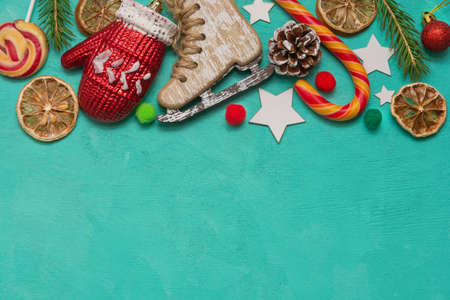 Christmas decorations and sweets on a green background. Flat lay. There is room for text.