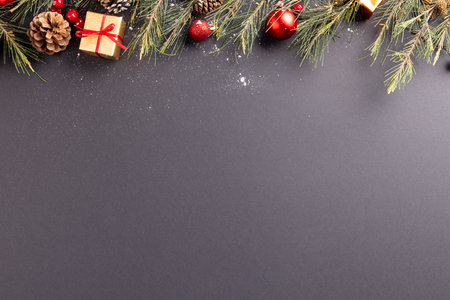 Composition of christmas decorations with baubles, presents and copy space on black background. christmas, tradition and celebration concept.