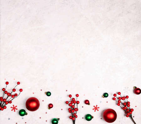 Christmas border of red and green decorations and berries on light marble background. Christmas, winter, new year concept with copy space.