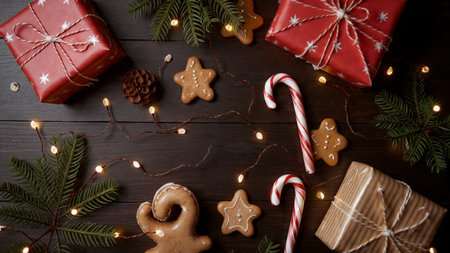 A beautiful flat lay of Christmas gifts, ornaments, gingerbread cookies, and pine branches on a dark green surface, creating a festive holiday atmosphere.