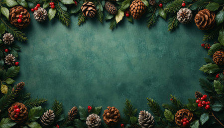 a festive frame of pine cones, berries and foliage on a textured green background.