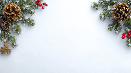 Christmas flat lay spruce twigs red berries and cones sprinkled with snow on a white background copy space