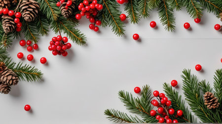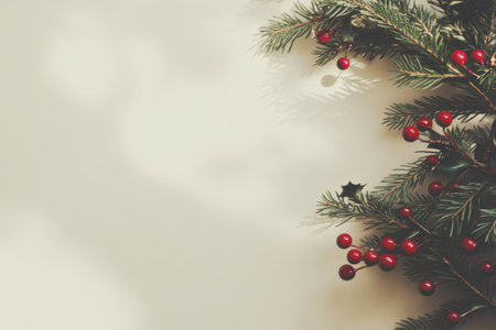 Evergreen branches adorned with red berries create a festive atmosphere suitable for holiday decorations and celebrations.