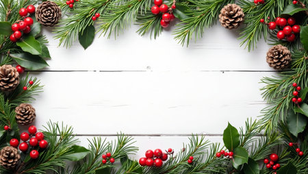 Christmas background with fir branches, red berries and pine cones on white wooden background
