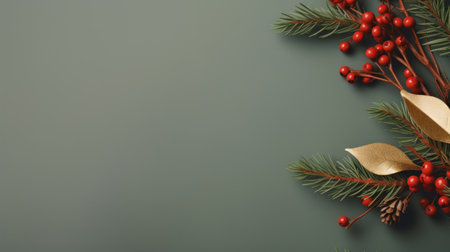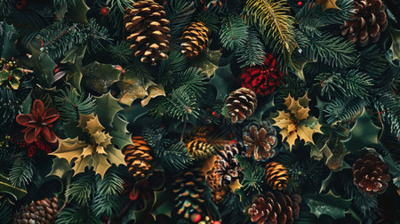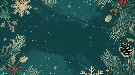 Green backdrop featuring red berries, pine cones, and lush foliage, evoking festive and natural charm.