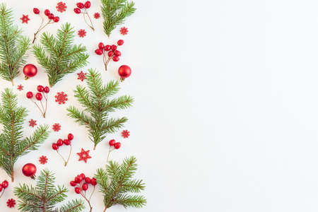 Christmas and New Year's composition. Top view of spruce branches and red berries on white background. Christmas frame made of dark fir branches, cones, red berries and decorations.
