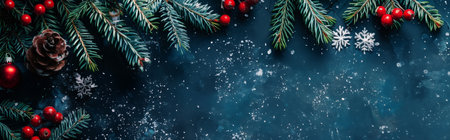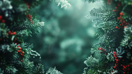 Cinematic high contrast composition featuring snow-dusted pine boughs and bright red holly berries forming natural frame. Perfect for holiday marketing, Christmas campaigns, winter themes.