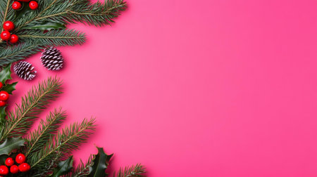 A beautiful arrangement of green foliage and bright red berries set against a soft pink background, perfect for seasonal decor and festive themes.