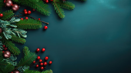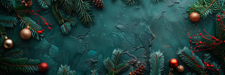 Bright Christmas ornaments and greenery lie on a dark green concrete background, creating an empty festive mockup perfect for showcasing holiday decor, banner
