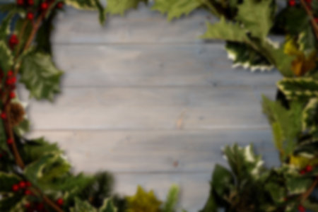 Cozy holiday composition with holly pinecones and berries on wooden backdrop
