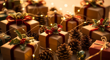 Delight in a cozy holiday scene featuring beautifully wrapped gifts with red ribbons, set against a backdrop of Christmas decorations and twinkling lights.