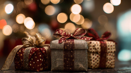 A festive scene of Christmas presents with bows under a decorated tree, illuminated by warm bokeh lights, capturing the holiday spirit.