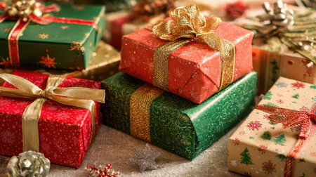 A variety of beautifully wrapped gifts with festive patterns and ribbons are arranged on a table, creating a joyful atmosphere for the upcoming holiday celebration.