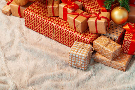 Merry Christmas. Stylish christmas gifts under Christmas tree with red and gold baubles. Presents wrapped in craft modern paper in festive scandinavian room. Space for text