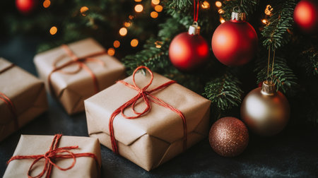Christmas holiday delivery and sustainable gifts concept. Red gift boxes wrapped in eco-friendly packaging with recycled paper under decorated xmas tree