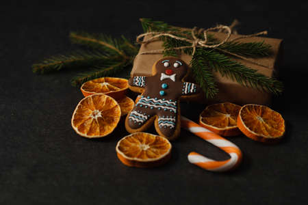 Christmas background with gingerbread cookies and gifts. New Year's layout on a black background.