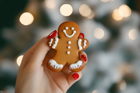 Hand holding gingerbread man with festive background.