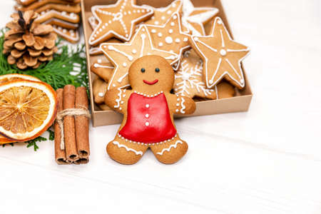 Sweet gingerbread cookie man and box of christmas cookies on white wooden background with copy space. Traditional christmas dessert. Holiday baking. Homemade cakes. New Year cooking. Xmas preparation
