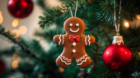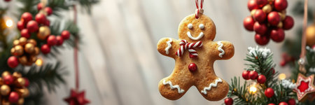 Gingerbread man ornament hangs among festive decorations for holiday celebrations