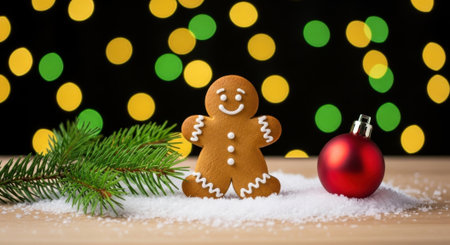 A gingerbread man cookie stands amidst artificial snow, a red ornament, and a pine branch, with bokeh lights in the background, creating a festive Christmas scene.