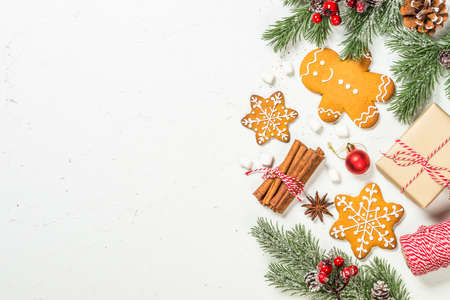 flatley layout of ginger holiday cookies with a blank background. Composition of Christmas gift boxes, cookies, cones.