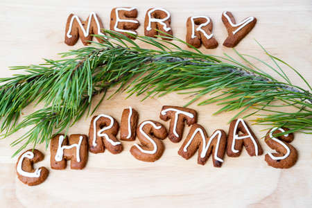 Homemade xmas gingerbread cookies and green branches on red table