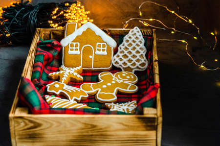 Christmas gingerbread cookies, decorated with sugar white icing in a wooden box on a dark background, Christmas garland. Holiday concept for Christmas and New Year. 2021, close-up.