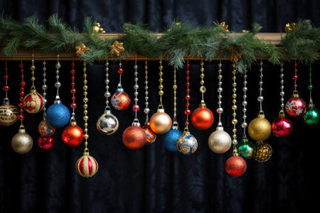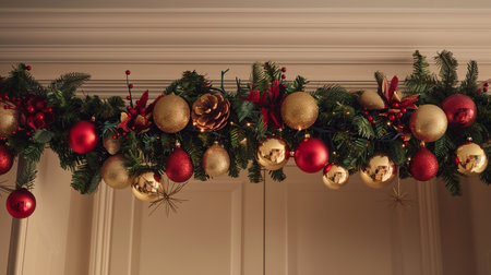 Festive Christmas Garland With Red and Gold Baubles Hanging From Ceiling