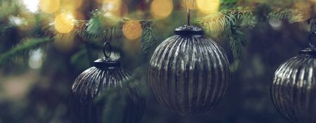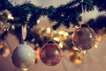 Baubles hanging on Christmas tree for decoration. Retro filter effect.