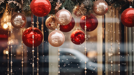 Christmas toy on the Christmas tree. New Year decoration. Decorated shop window.