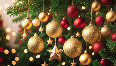 A close-up view of various Christmas tree ornaments, including red and gold baubles, hanging from a green fir tree, with soft bokeh lights in the background.
