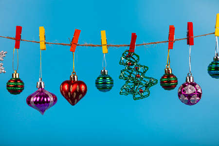 Christmas decorations hang on a rope on a blue background. Place for your text. Christmas card.