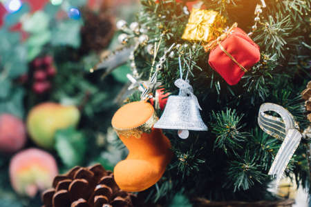 Beautiful Christmas ornaments and decorations hanging in the Christmas tree