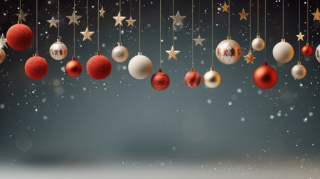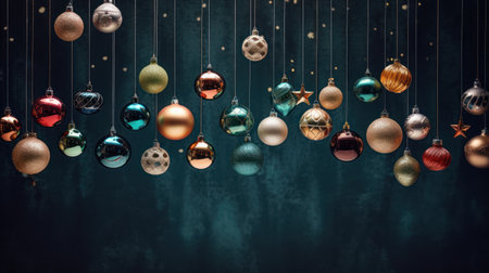 Christmas background decoration baubles balls hanging. Decorative beautiful Ball. Xmas Ornament Balls. Festive New Year template for postcard and banner design. generative ai