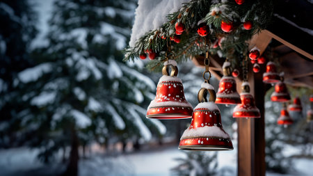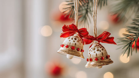 Capture the magic of the holiday season with these beautifully crafted Christmas bells adorned with red ribbons, perfectly complementing a festive atmosphere.